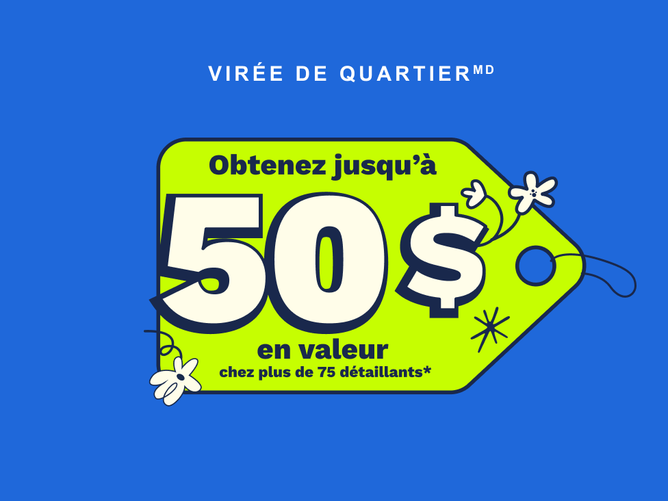 Commencez par magasiner chez seulement 2 partenaires pour vous rapprocher de 50 $ en valeur* jusqu’au 15 avril. * Des modalités s’appliquent.